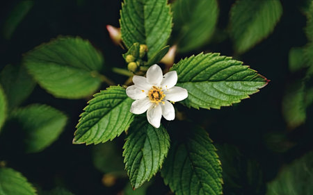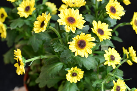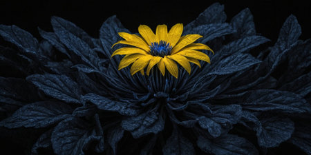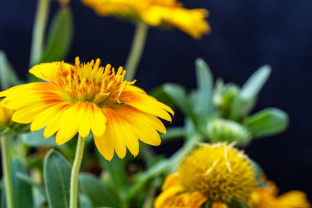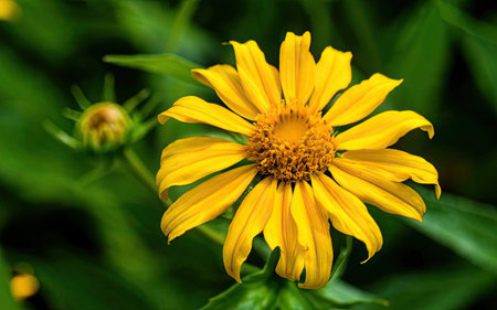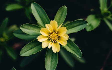 Yellow flower with green leaves, close-up view. Nature and tranquility concept