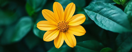 A vibrant yellow flower blooms amidst lush green foliage, showcasing the beauty of nature. This close-up highlights intricate petals and lively colors, perfect for various design projects.