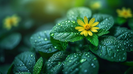 A close-up view of a bright yellow flower with numerous water droplets on its delicate petals, surrounded by lush...