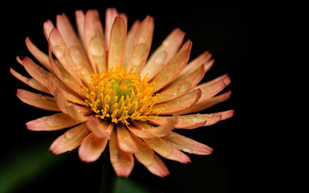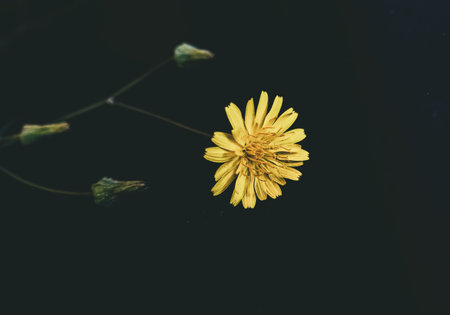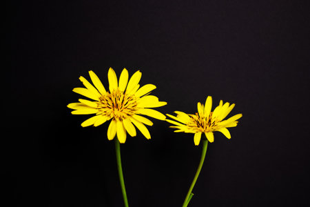 Yellow flowers, black background, green, beautiful petals, bright, cheerful, lively The area for text on the right, copy area, focus on pollen and background blur.