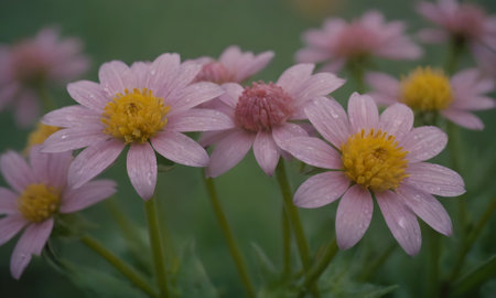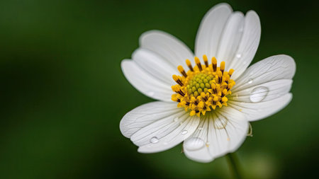A macro shot reveals a delicate white flower, its petals radiating from a vibrant yellow center. Water droplets cling to the petals, adding texture and detail. The background is a soft, blurred green. This image could be used for various commercial projects, including print and digital media.