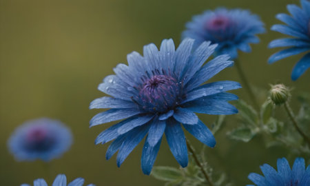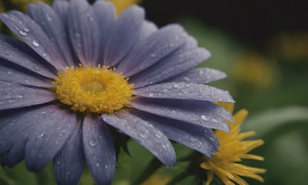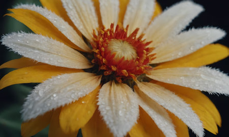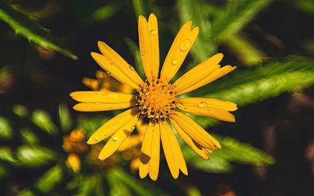 A vibrant yellow flower, part of the Daisy family, displays delicate water drops on its petals. This closeup shot captures the beauty of a flowering plant in bloom