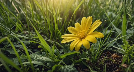A vibrant yellow flower with multiple petals stands tall in a lush green field of grass