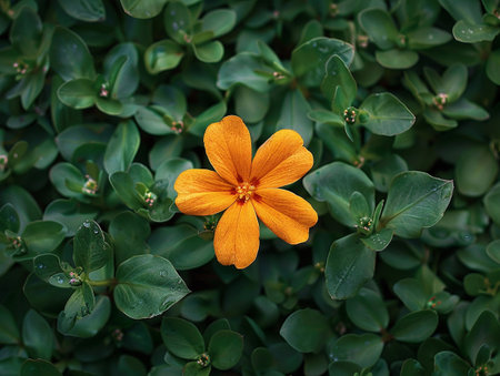 A bright orange flower standing out amidst lush green foliage, viewed from above.