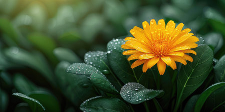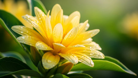 Beautiful yellow flower with water drops on green leaves background, selective focus