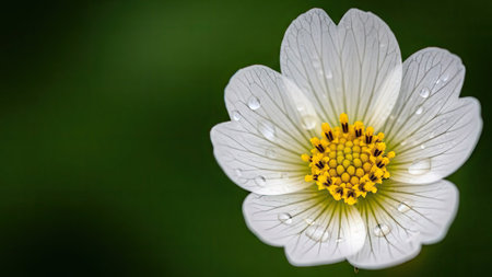 A close-up captures a pristine white flower with a vibrant yellow center, highlighted by water droplets. The soft petals contrast against the dark green backdrop. The image utilizes natural lighting and shallow depth of field, suitable for various editorial and commercial applications. The composition emphasizes detail and texture.