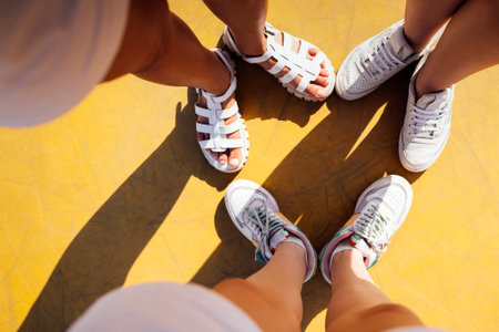 Engaging scene showcasing a diverse group of people in colorful sneakers forming a circle, with hands touching the ground, symbolizing unity and friendship.