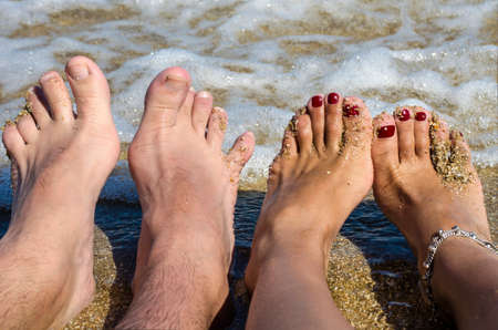 View of a couple's feet on the sand beach. Close-up of feet of a pair of lovers.One man and one girl feel free on the beach