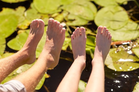 pair of bare feet heathy man and woman standing opposite on soft refreshing green grasses lawn yard with copy space.