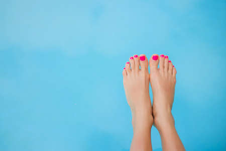 Female bare feet on a blue background. Beauty concept. Studio shot. Top view