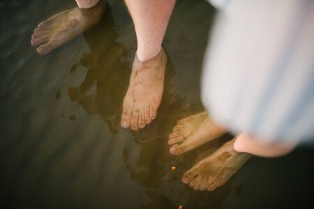 Top view of the legs in summer flip flops, part of the bridge and the river.
