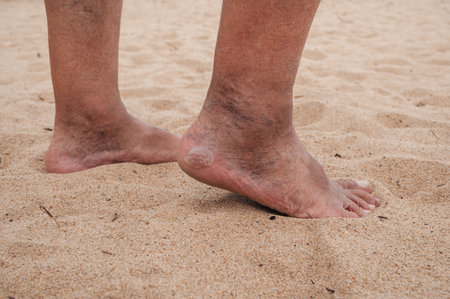Corns, calluses on the heels of an elderly mans feet, inflamed dilated veins on his legs.