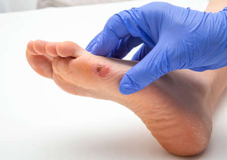 Foot with corns, calluses and dry skin, wart plantar verrucas. Verrucas papilloma callus virus, desease on foot skin. Unhealthy foot leg with corn close up. Man shows callosity before treatment.