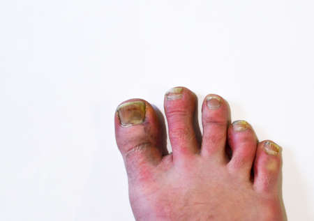 Illice finger with whitlow in foot of elderly woman with calluses and blood circulation difficulties