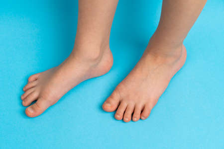 childrens feet on a blue background front view, the concept of prevention of childrens flat feet, hallux valgus