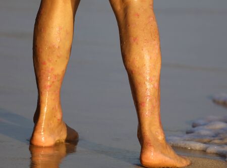 a lot of mosquito bites on mens legs. allergy from a bite on the skin