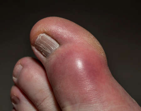 The inflammation and discoloration of the big toe due to Gout or uric acid crystals in the joints