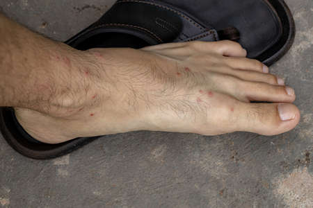 Human feet with various allergic reactions to tick bites with selective focus
