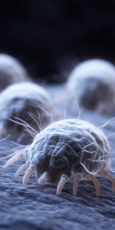Microscopic dust mites populating human skin surface, revealing tiny organisms triggering allergic reactions and potential health complications in residential environments