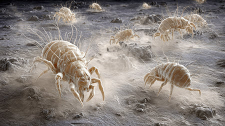 This close-up image depicts dust mites amidst fibers, showing detailed exoskeletons and appendages. The composition features a neutral color palette with a focus on textures and forms. This illustration may be suitable for educational purposes, scientific publications, or commercial applications related to health and hygiene.