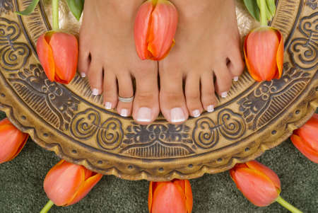 Manicure, pedicure beauty salon concept. Womans feet on white background