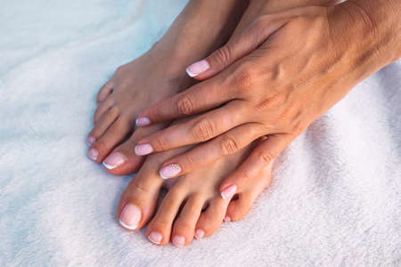 Beautiful woman hands and feet with french manicure and pedicure on a white background