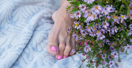 beautiful female feet with pink pedicure on toes close-up on a bedspread with a bouquet of wild flowers asters