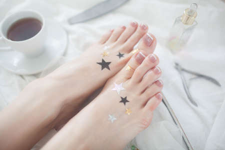 French pedicure on beautiful well-groomed female legs. Large manicure on white background done quality in a salty spa. Spa treatment.