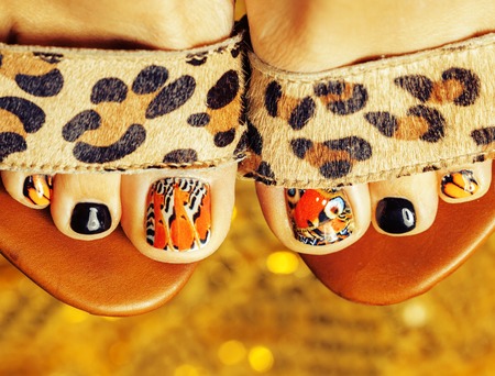 Women's feet with amazing pedicure. Nails with gel polish applied.