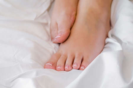 Beautiful female tanned legs on a white bedclothes in bed, with a laconic pedicure, relaxed woman, with copyspace