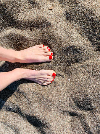 Close up of female feet with red neon painted toe nails. Beauty concept.