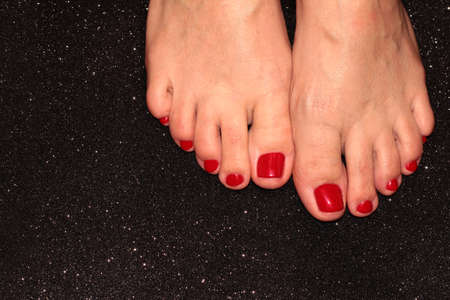 Red pedicure. On a black background, women's legs with a red pedicure.