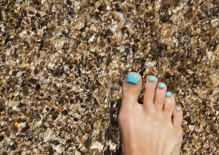 Bare feet of a woman with turquoise nail polish standing on a sandy beach washed out by foamy wave of water from the sea.
