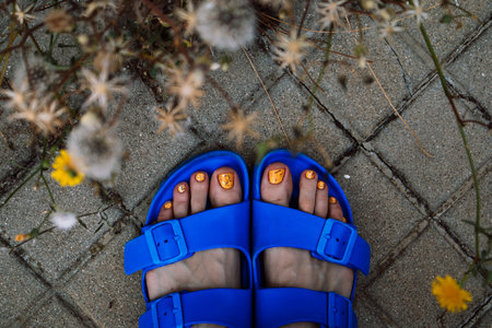 A person wearing bright blue sandals with gold nail polish, captured from top-down perspective. Surrounding details include plants and paved ground.