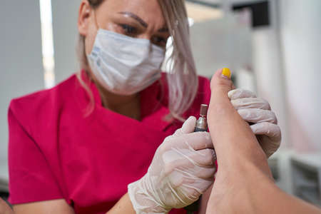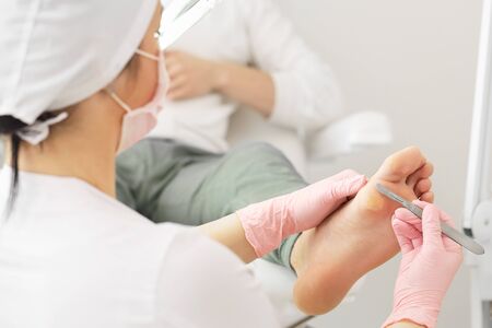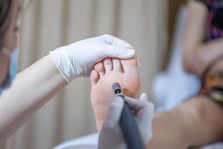 Podology treatment. Podiatrist. Doctor removes calluses, corns and treats ingrown nail. Hardware manicure. Health, body care concept. Selective focus.Podology pedicure. Pedicure without gel or varnish