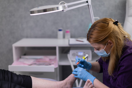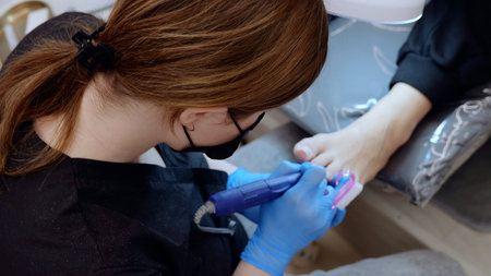 A pedicurist treats the toes of a client using a machine with an abrasive disc in a beauty salon.