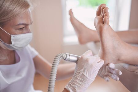 Podiatrist doctor using grinding equipment and making procedure polish for feet pedicure. Podology beautician in white gloves cleaning skin of client legs from callus and corn with professional tool.