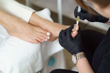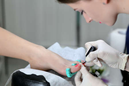a gloved master makes a pedicure for a client. close-up no face. woman in a nail salon paints her nails with red varnish
