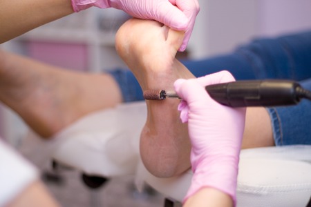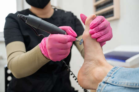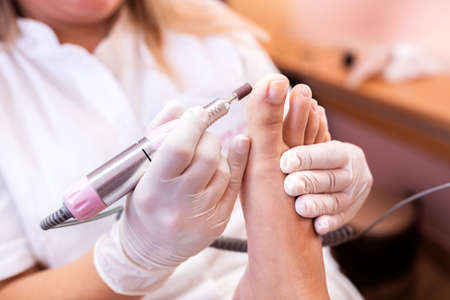 Pedicure master removes corns and cuticles with electric file machine on female toes in a nail salon