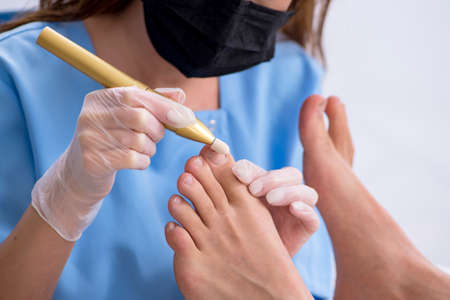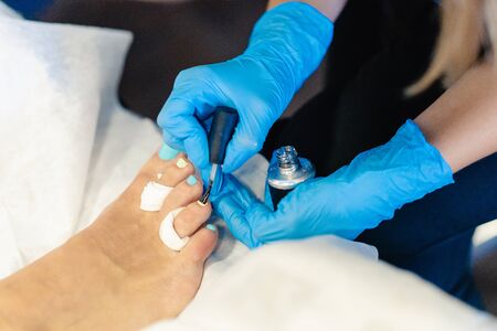 Podiatrist treating toenail. Podology treatment. Podology of applying gel polish to remove onycholysis. The procedure for treating the nail plate with a podologist in a medical office