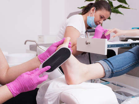 Macro shot of a beautician in gloves filing female nails. Professional pedicure at beauty treatment salon