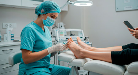 Medical pedicure procedure using special instrument with blade knife holder.Professional pedicure using dieffenbach scalpel.Patient visiting podiatrist.Foot treatment in SPA salon.Podiatry clinic.