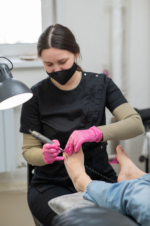 Beautician in black uniform and face mask using electric nail drill for professional pedicure and nail polish removal