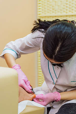 Professional pedicure in the beauty salon. The beautician cuts the skin with fingernails and performs professional pedicure. Podology treatment. Podiatrist. Health, body care concept.