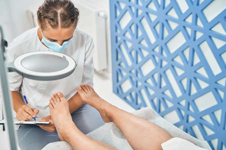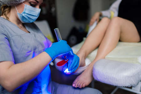 Using lamp. Professional experienced chiropodist using lamp while practicing acupressure for elegant woman