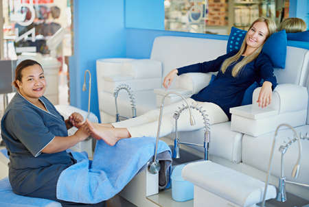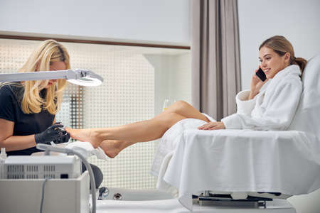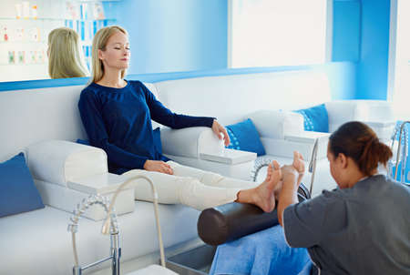 Specialist with client in beauty salon. Professional beauty service. Pedicure, manicure concept.
