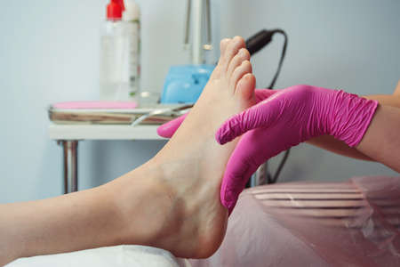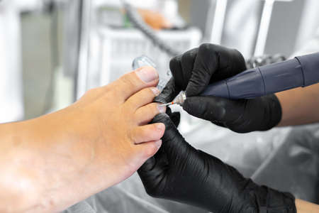 Master pedicure in sterile gloves shapes nails and cuticles closeup . Hardware manicure. Concept body care.