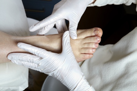 male pedicure. A pedicure master with gloves holding a man's foot.