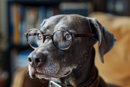 Closeup portrait of a cute and intelligent grey domestic canine wearing stylish round eyeglasses. Conveying a scholarly and thoughtful expression