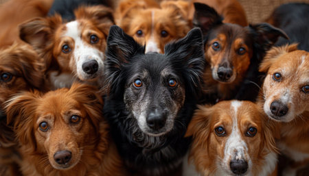 A group of cheerful dogs gather closely, displaying bright eyes and happy faces. Their diverse fur patterns and colors reflect the fun atmosphere of a playful day outdoors.
